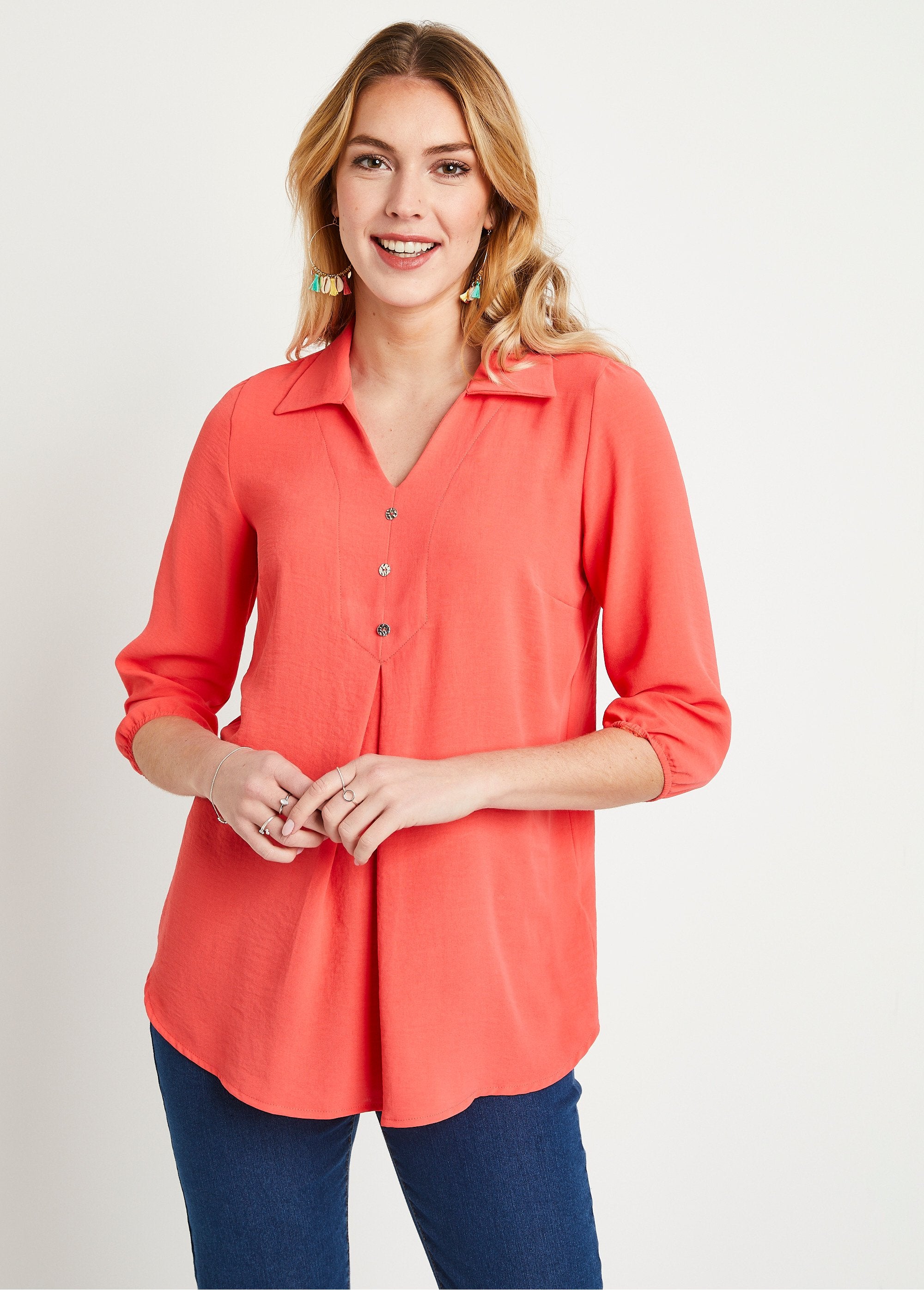 With its cool look without being too casual, the 3/4 sleeve tunic has a great style with a simple, but effective cut. Its shirt collar is open in a V with a false button front. And to give it fullness: a box pleat at the front and another under the middle cutout at the back. French made.
